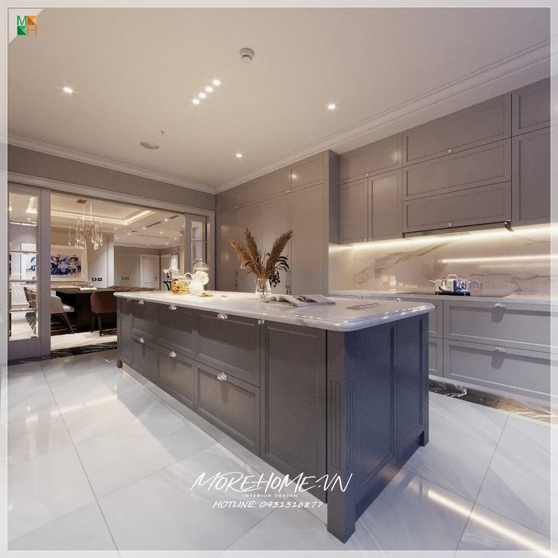 Tủ bếp kết hợp gỗ tự nhiên sơn tông màu ghi và mặt đá nhân tạo màu trắng vân mây được trang trí bằng bàn đảo bếp, tạo nên một cảnh quan sang trọng.